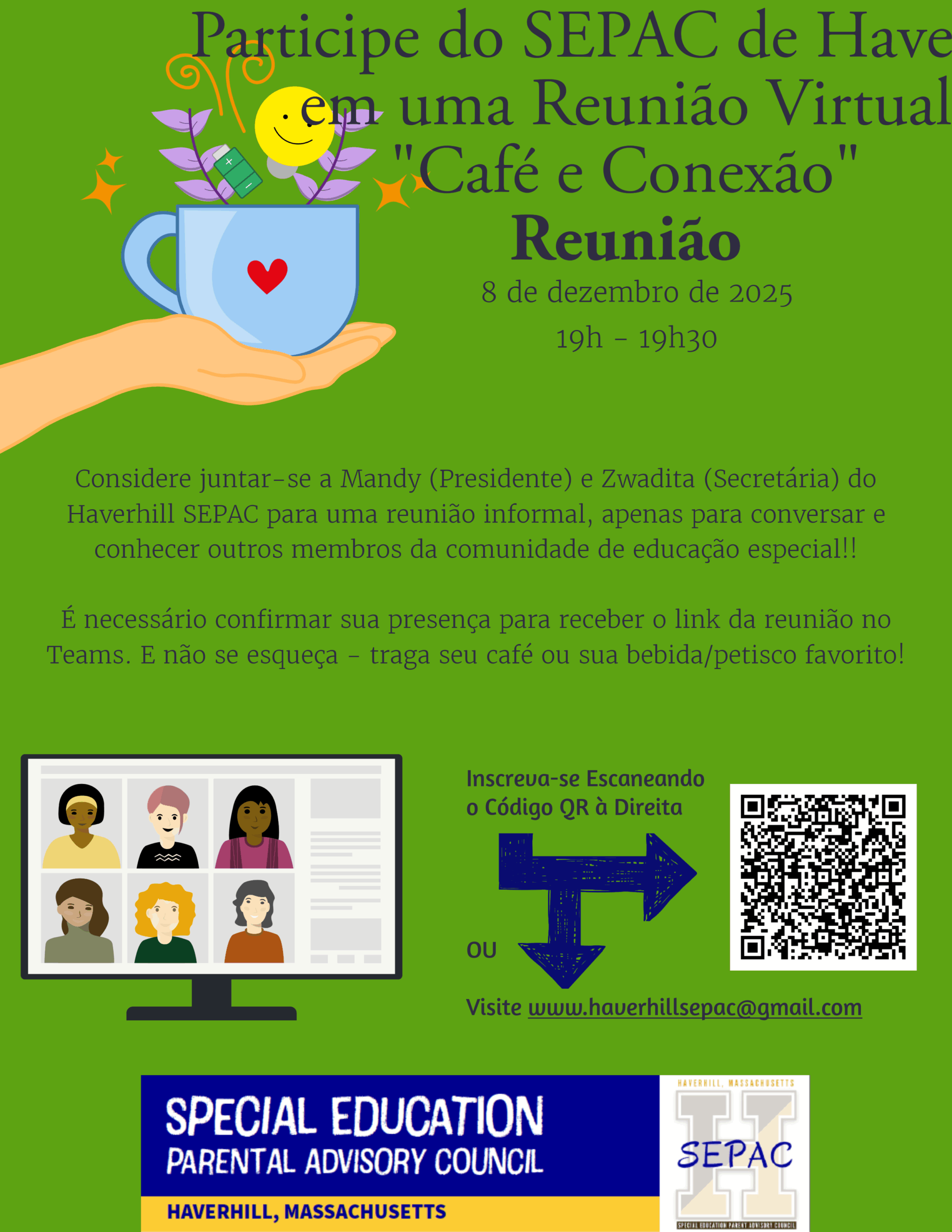 Please consider joining Mandy (Chair) and Zwadita (Secretary) of the Haverhill SEPAC for an informal meeting to simply chat and meet other members in the special education family community!!