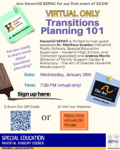 Haverhill SEPAC is thrilled to host guest speakers Dr. Matthew Scanlon (Haverhill Public Schools, Special Education Supervisor – Haverhill High School, and Transition Specialist) and Andrea Morris (Director of Family Support Center & Advocacy – The Arc of Greater Haverhill Newburyport).